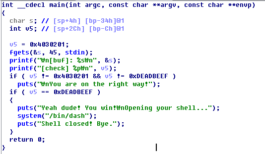 v5의 값이 0xdeadbeef면 쉘을 딸 수 있는 것 같다.