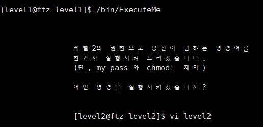 - my-pass, chmod도 아닐 경우 level2의 GID 권한으로 명령을 실행하는 부분