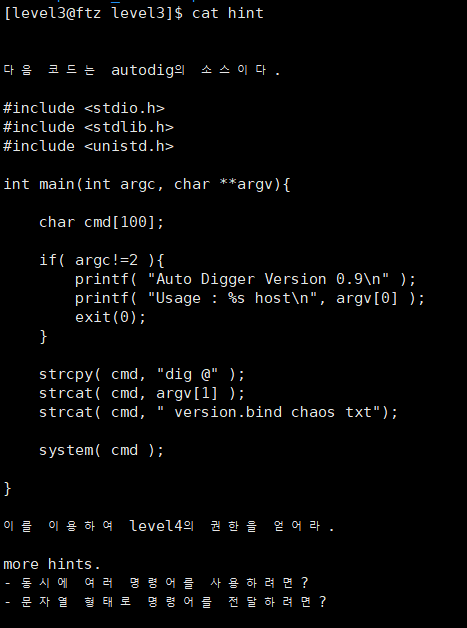 우선 level4 권한의 setuid가 걸린 파일을 찾아보니 autodig 파일이 나온다.