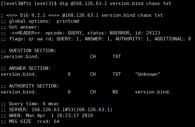: 168.126.63.1에 대한 BIND 프로그램의 버전을 조회하게 된다.