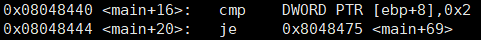- <main+16> EBP+8 위치의 값이 0x02와 같은지 비교