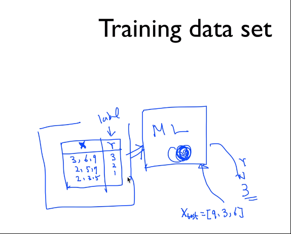 : 정해져 있는 데이터, 이 데이터는 label이 정해져 있음. training set 을 가지고 학습을 하는 것.