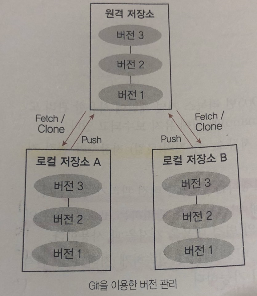 : 버전 관리 작료가 하나의 원격 저장소, 분산된 개발자 PC의 로컬 저장소에 함께 저장되어 관리되는 방식