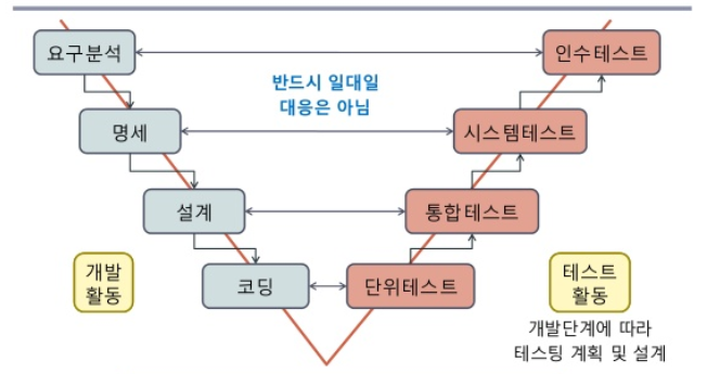 - V-모델: 애플리케이션 테스트와 SW 개발 단계를 연결하여 표현한 것