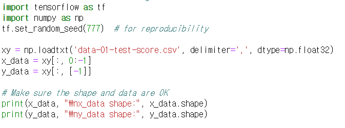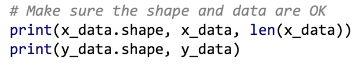 - xy를 ':(콜론)'으로 슬라이싱하여 x_data와 y_data에 배정
