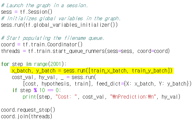 : train_x_batch와 train_y_batch 또한 tense이기 때문에 sess.run()을 해 준다.