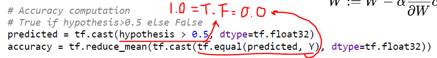 예측 값들의 정확도를 계산해보기 위해서는 predicted(예측 값)과 y의 값을 비교하여 T, F로 산출 --> casting
