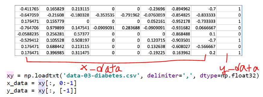 y_data의 값은 binary 값으로 주어짐. (0 or 1)