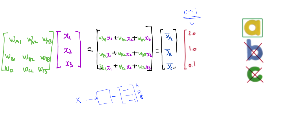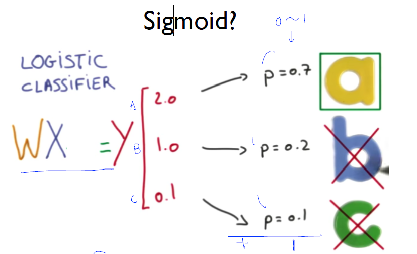 - logistic classifier를 이용하여 벡터를 주어 계산을 하게 되면 y와 같은 입력 값에 대한 세 개의 vector 값이 나오게 된다.