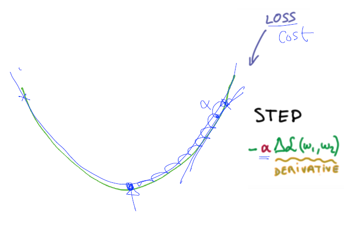 알파 값만큼 한 발자국씩 내려가면서 최저값을 찾게 됨.
