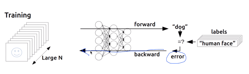 - 출력값, 예측값을 비교하여 거기에서 나온 오류(error, cost)를 뒤에서부터 앞으로 전달하여 미분값과