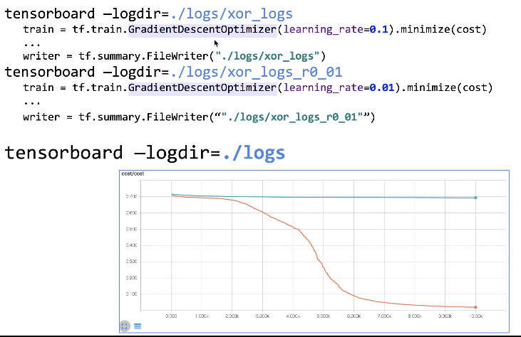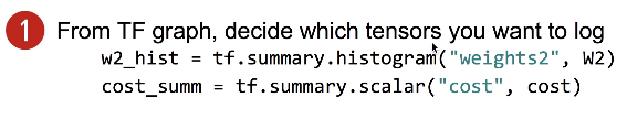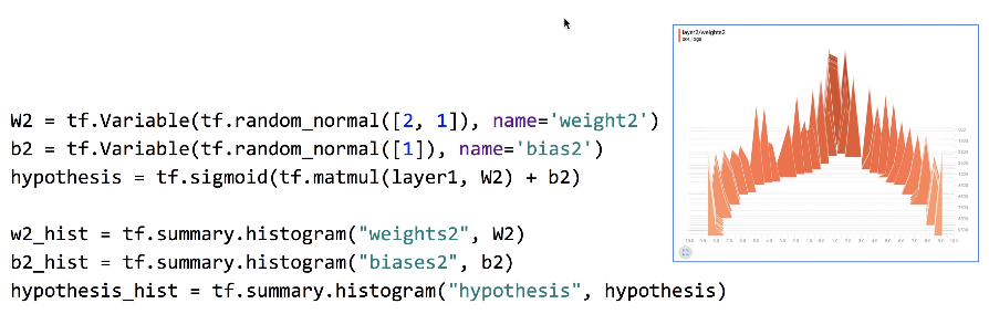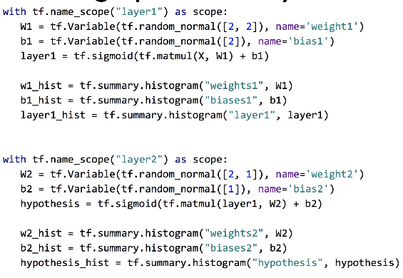 - tf.name_scope() 라는 것을 이용하여 tense들을 계층별(layer별)로 정리할 수 있음.