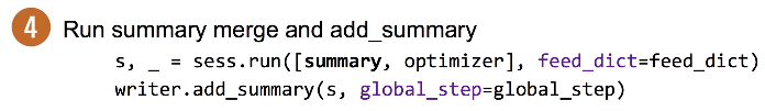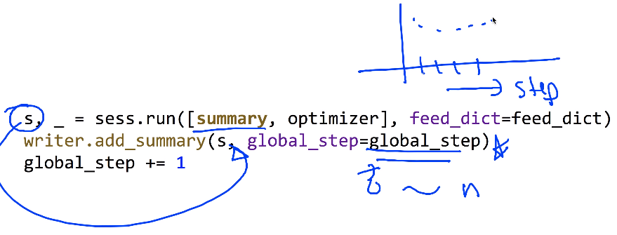 - 실행시킨 summary를 실제로 파일에 기록하는 부분: writer.add_summary