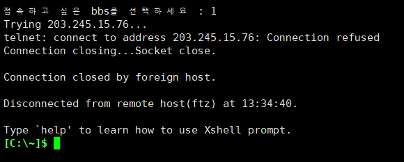 어느 번호를 입력하든 텔넷 접속이 실패하면서, 현재 연결 중인 텔넷 세션도 끊어졌다.