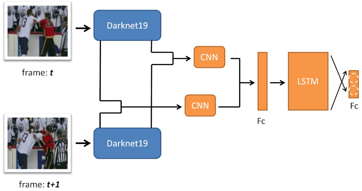 A CNN takes the input video frames and outputs the features to the Long Short-Term Memory (LSTM) to learn global temporal features and finally classify the features by fully-connected layers. This network can not only implement by the pre-trained models in ImageNet, but also have the flexibility to accept variable length videos, and even boosts the accuracy to the 98.5% while still processing the image in real-time (80 fps on Nvidia GTX 1080 Ti).