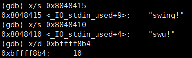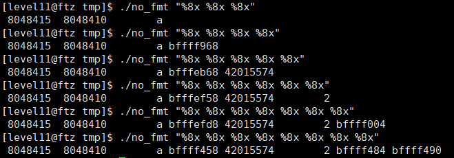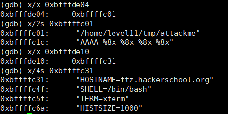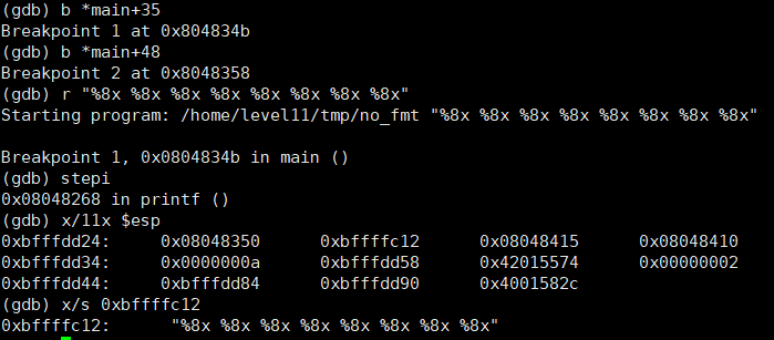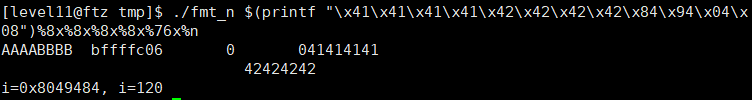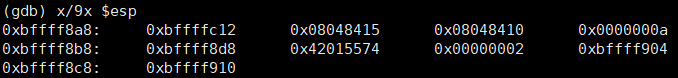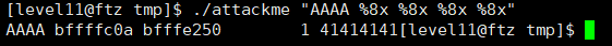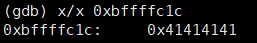 | 0xbffffc10 | &(AAAA %8x~ ) |