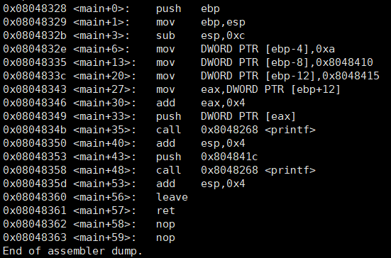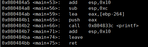 - printf()를 호출하기 전 함수의 인자를 전달하기 위해 스택값에 인자를 푸시한다.