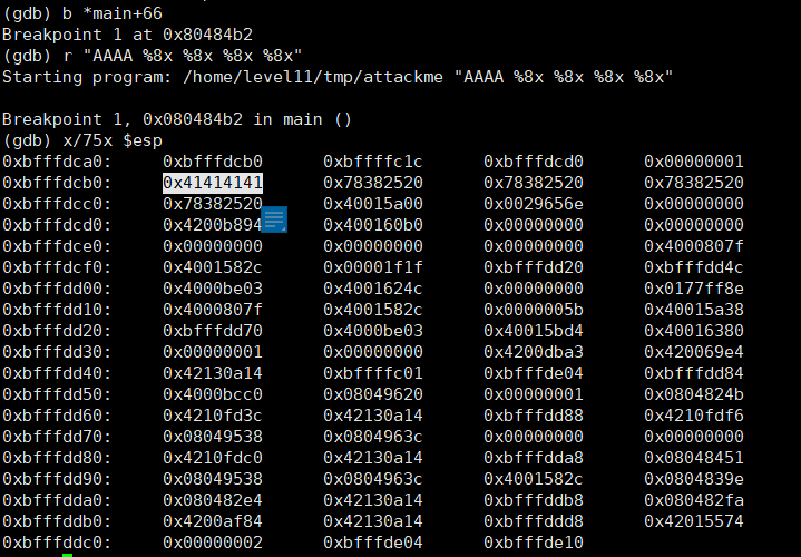 AAAA 문자열 뒤에 있는 %8x 지정자에 대한 반응으로 "AAAA %8x %8x %8x %8x" 포맷스트링 문자열보다