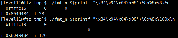 $(printf "AAAA낮은주소AAAA높은주소")%8x%8x%8x%정수c%n%정수c%n