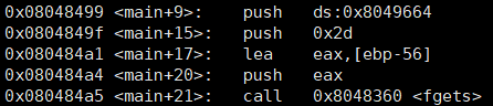 >> fgets(ebp-56, 0x2d, 0x8049664)