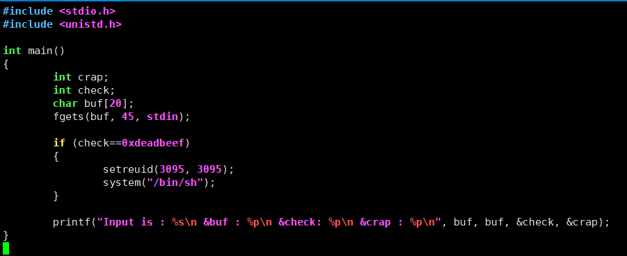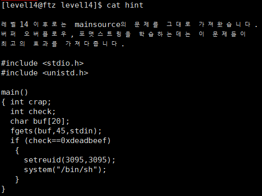 - buf는 20byte 크기인데, fgets로 입력은 45byte까지 받게 되어있다.