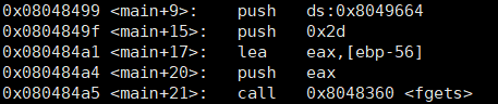 >> fgets(ebp-56, 0x2d, 0x8049664)
