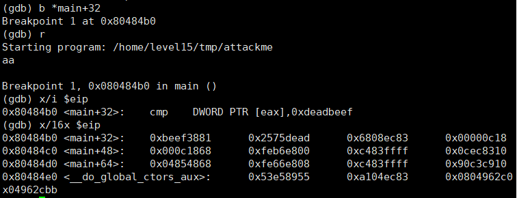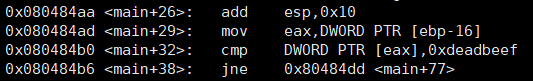 0xdeadbeef을 비교하는 곳에 bp를 걸어두고 프로그램을 실행한 후 $eip을 조사했다.