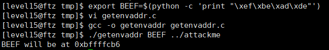 - 위 소스코드를 실행시켜 환경변수 BEEF의 주소를 알아낸다.