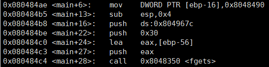 >> fgets(ebp-56, 0x30, 0x804967c)