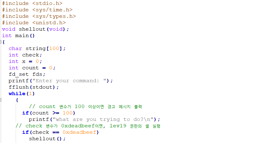 - check 변수가 0xdeadbeef여야 shellout() 함수가 실행된다.