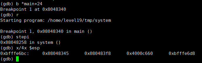 - 또 다시 4byte 아에 셸을 실행시킬 인자인 "/bin/sh" 문자열의 주소가 있어야 함.