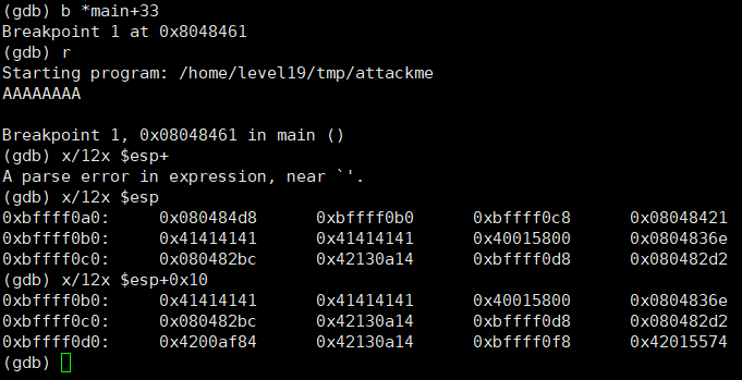 0xbffff0b0 ~ 0xbffff0d8 이전까지가 확보된 것을 알 수 있다.